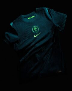 The away kit presents a dark forest green base adorned with luminous patterns that blend traditional prints with contemporary designs, symbolizing the Super Falcons’ fierce spirit.